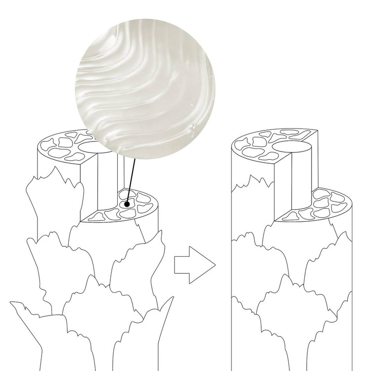 فرمولاسیون با غلظت بالای مواد مؤثر از جمله فناوری ترمیم پیوند و کمپلکس براق کننده، به راحتی به درون کوتیکول نفوذ کرده و تا مغز مو پیش میرود تا پیوندهای آسیب دیده را بازسازی کرده و ساقهی مو را از ریشه تا نوک تقویت و صاف کند.