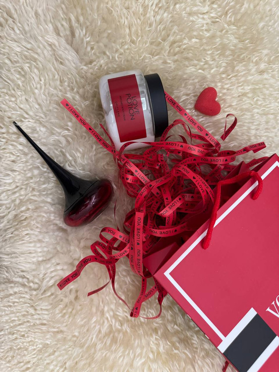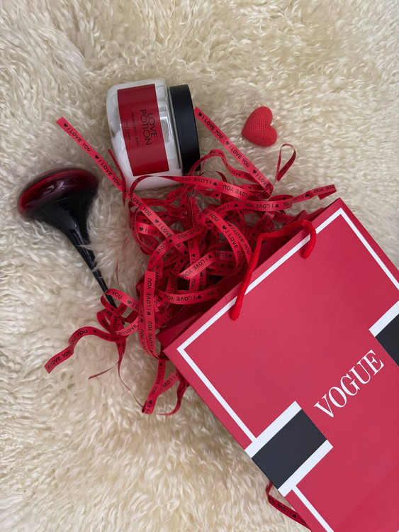 به همراه آن بگ و پوشال قرمز رنگو شمع قلبی داخل بسته قرار دارد
